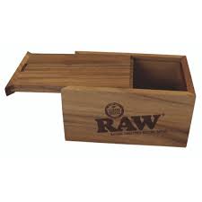 This little RAW Wooden Rolling / Storage Box, with a magnetic compartment in the sliding lid. RAW Logos On Both Sides Of The Box